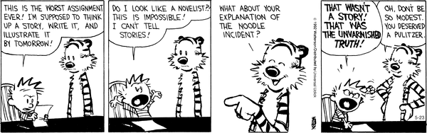 And from there I ask myself, What did Dave see? What interesting thing happened to Dave? And then I come up with, “Dave found something meaningful on the sidewalk” or “Dave had just emerged from donating blood, so he was woozy” or “Dave saw a homeless man lying still and feared that he might be dead…” And away I go.